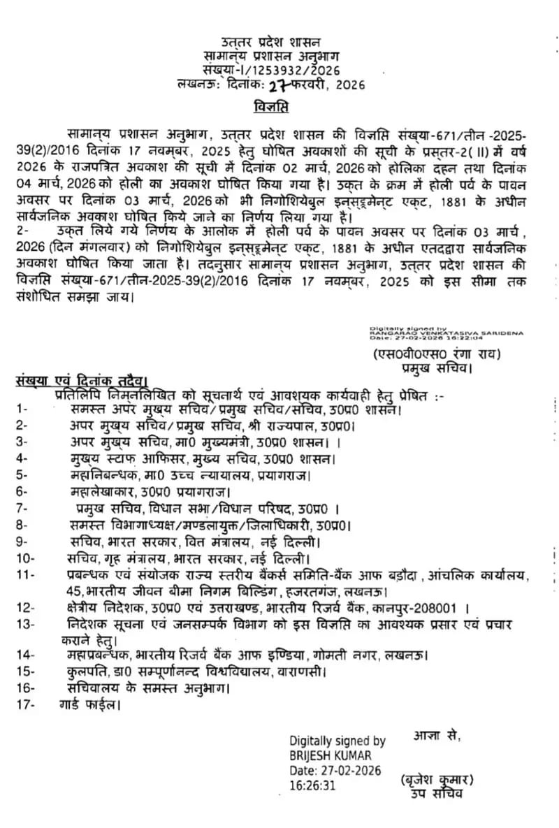 Holi School Holidays: होली की छुट्टियां फिर से घोषित कर दी गई है। और राज्यों के ऑफिशियल कैलेंडर के आधार पर होली की छुट्टियां पहले से निर्धारित कर दी जाती है। उत्तर प्रदेश के मुख्यमंत्री योगी आदित्यनाथ के द्वारा इस बार होली के त्योहार पर 3 मार्च का छुट्टी का ऐलान कर दिया है। उत्तर प्रदेश में 1 मार्च से 4 मार्च तक लगातार चार दिनों की छुट्टियां रहने वाली है। उत्तर प्रदेश, बिहार, राजस्थान, दिल्ली सहित राज्यों हेतु छुट्टियों की अलग-अलग अपडेट्स निकलकर आ रही है। इस बार वर्ष 2026 में रंग वाली होली 4 वर्ष को ऑफिशियल रूप से मनाया जाएगा। आमतौर पर देशभर के जितने भी स्कूल है रंग वाली होली के दिन स्कूलों में छुट्टियां रहेंगी। कुछ जगह 3 मार्च को छुट्टी का ऐलान किया गया है तो कुछ जगह स्कूल खोले जाने का आदेश जारी किया गया है। होलिका दहन का छुट्टी 2 मार्च को रहेगा। छात्रों का विभाग को हेतु एक बड़ी असमंजस की स्थिति है कि होली की छुट्टियां 3 मार्च को रहेंगी या फिर 4 मार्च रहेंगे और कौन से राज्यों में होली की छुट्टियां कब-कब रहेंगे पूरी डिटेल में जानकारी बताई गई है।
